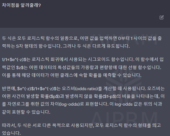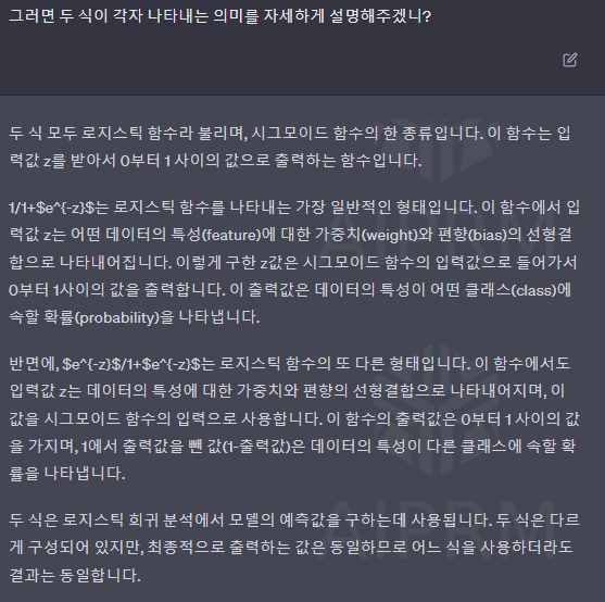 따라서, 두 식은 서로 다른 목적으로 사용되지만, 모두 로지스틱 함수의 형태를 띄고 있습니다.