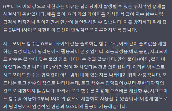 0부터 1사이의 값으로 제한하는 이유는 딥러닝에서 발생할 수 있는 수치적인 문제를 해결하기 위함입니다.