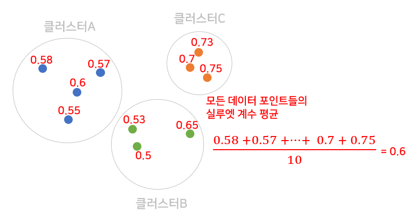 각 데이터 샘플의 군집 내 유사성과 군집 간 분리도를 종합적으로 고려하여 계산됩니다.