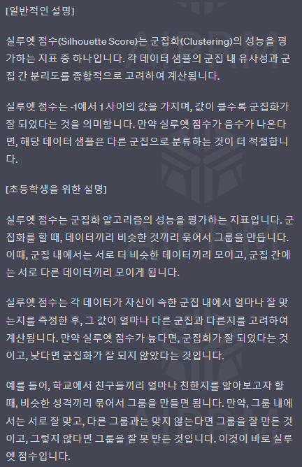 실루엣 점수는 -1에서 1 사이의 값을 가지며, 값이 클수록 군집화가 잘 되었다는 것을 의미합니다.