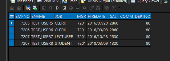 VALUES (7205,'TEST_USER5','CLERK',7201,'2016-07-20',2600,NULL,70);